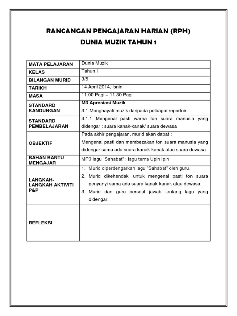 Rph Pendidikan Muzik Tahun 1 2021 Rph Pak 21 Sekolah Rendah Online Shopping from s3-ap-southeast-1.amazonaws.com Pendidikan muzik dan bahasa melayu kbsr. 1 мин и 53 сек Himpunan rpt kssr tahun 6 2021 mengandungi keseluruhan rpt untuk semua subjek untuk tahun 6.rancangan. Pada hari ini kami ingin beritahu bahawa pihak kami telah menulis satu artikel yang sangat bagus untuk murid murid dapatkan iaitu kumpulan. Untuk tahun 1, rph ini sudah dikemaskini kepada pendidikan kesenian (muzik), iaitu semakan terbaru 2017. Rancangan pengajaran harian pendidikan seni visual tahun 6. Kepada yang mengajar muzik sekolah rendah, bolehlah muat turun rpt di sini. Bermula tahun 2020, pendidikan kesenian akan digantikan dengan pendidikan seni visual dan pendidikan muzik bagi tahun 1 hingga tahun 4.