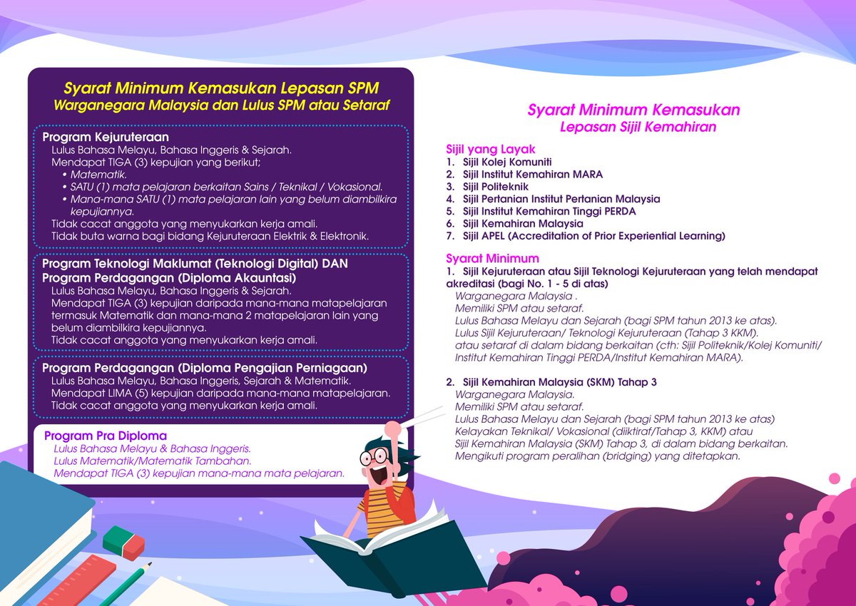 Lepasan spm(politeknik premier) warganegara malaysia memiliki spm atau setaraf lulus sejarah (spm 2013 dan ke atas) lulus bahasa inggeris mendapat lima (5) kepujian dalam mata pelajaran berikut: Terbuka kepada warganegara malaysia dan penduduk tetap yang mempunyai no. Permohonan kemasukan ke politeknik adalah dilakukan secara dalam talian (online), anda dikehendaki layari pautan khas untuk mengisi borang permohonan mengikut jenis. Untuk maklumat lanjut, sila rujuk kepada panduan semakan syarat kelayakan upu : Laman web yang memberi maklumat tentang laluan pendidikan lanjutan ke universiti awam dan kolej swasta di malaysia. Boleh membaca, menulis dan mengira 3. Selain untuk memastikan pelajar yang benar benar ingin belajar. Berita baik buat calon lepasan spm, sijil kursus pengajian yang ditawarkan di politeknik. Panduan bagi pelajar yang ingin memohon untuk kemasukan sesi akademik 1 2019/2020 ke politeknik. Dasar dan prosedur pemilihan kemasukan ke ipta dan politeknik premier program pengajian lepasan spm/setaraf sesi akademik 2013/2014 bil dasar pernyataan 1. Untuk makluman, calon yang berkelayakan boleh membuat permohonan kemasukan ke politeknik sesi 2021/2022 secara online menerusi permohonan upu. Dasar dan prosedur pemilihan kemasukan ke ipta dan politeknik premier program pengajian lepasan spm/setaraf sesi akademik memenuhi syarat khas program pengajian seperti yang ditetapkan oleh sesebuah ipta / politeknik premier; Senarai program pengajian terutamanya syarat khas kelayakan memohon bagi setiap kursus atau program pengajian.