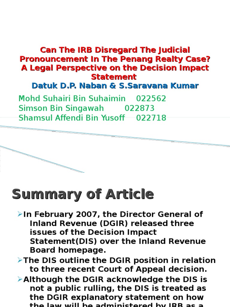 Director general of inland revenue enclosed herewith is the cheque/money order/postal order/banker's cheque for the payment of income tax. The assessments arose from the refusal of the revenue to accept that during the relevant period the taxpayer was entitled to set off capital allowances in repect of qualifying plantation expenditure against income derived from its timber operations. • treating the shop house project and the tar centre as an integrated whole. Dgir is defined as director general of inland revenue (malaysia) somewhat frequently. These new purchase price allocation (ppa) rules, which come in to force on 1 july, apply to the sale of assets such as commercial property, forestry land or a business. A well trained workforce is a prerequisite for the success of any organization. Director general of inland revenue. We're taking you to our old site, where the page you asked for still lives. Department of inland revenue 2004 to 2005 accounts. No addition, alteration, amendment or revocation shall be made to the constitution of the university without the approval of the registrar charged with the responsibility for companies and the director general of inland revenue board of malaysia before it is enforced. Transparency and freedom of information releases. Eu council directive 2011/16/eu of 15 february 2011 on administrative cooperation in the field of taxation and repealing. 10 commissioners of inland revenue v sema group pension scheme trustees 2002 74 tc 593.
