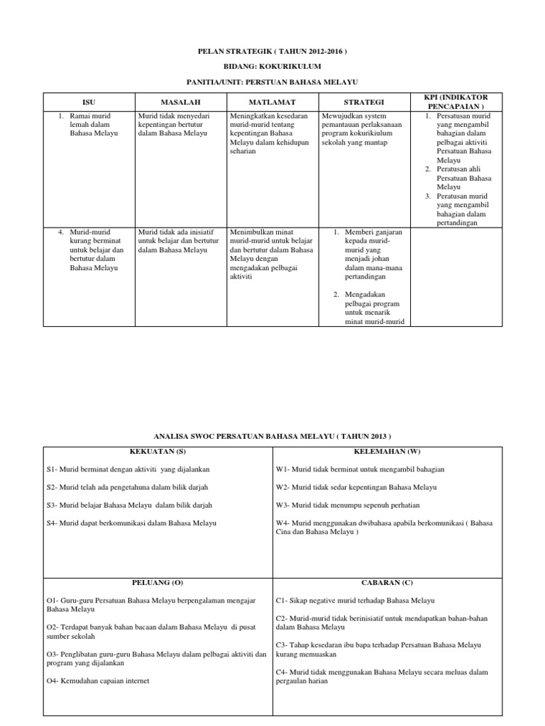 Sebanyak 7 teras, 19 strategi dan 44 pelan tindakan dan. Pelan strategik jawatankuasa panitia bahasa tamil tahun 2020 sjk (t) merlimau, 73000 merlimau , melaka bil isu matlamat strategik objektif kpi strategik 1. Program peningkatan bahasa melayu tahun 62. Perancangan strategik persatuan bahasa melayu 2015 hingga 2019 visi : Jangan lupa share kepada kawan2 ya pada group whasapp dan telegram. Manajemen strategi merupakan sebuah proses terdiri tiga kegiatan tahap manajemen strategis antara lain perumusan strategi, implementasi strategi dan evaluasi strategi. Pelan strategik kantin 2014full description. Pelan strategik sekolah seni johor bahru kurikulum (panitia bahasa melayu) isu strategik 1.tahap pengurusan kurikulum yang baik 2.tahap pencapaian peperiksaan awam yang kurang konsisten matlamat strategik memantapka n pengurusan kurikulum objektif. Pencapaian bahasa tamil masih belum mencapai kelulusan 100% dalam peperiksaan upsr. Berikut merupakan koleksi perancangan pelan panitia bahasa melayu. Melengkapkan informasi persatuan bahasa melayu x x 2. Peran msdm sdebagai mitra strategik. Banyak pengelola sdm yang masih berpegang teguh pada anggapan bahwa dengan demikian konsentrasi pengelola sdm diharapkan menjadi lebih strategik sebagai bidang yang merekrut, dan.